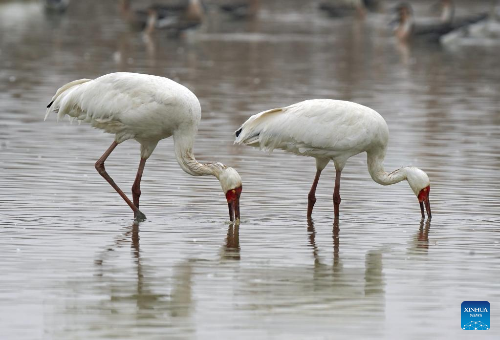 This photo taken on Jan. 12, 2022 shows white cranes at a crane sanctuary in Nanchang, capital of east China's Jiangxi Province. Nanchang has two wetlands of international importance, eight national wetland parks, four wetlands of provincial importance and five provincial wetland parks. It was accredited on Nov. 10, 2022 by the Ramsar Convention as an international wetland city. (Xinhua/Wan Xiang)