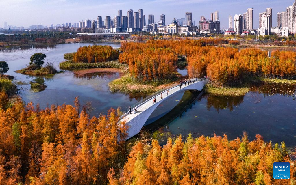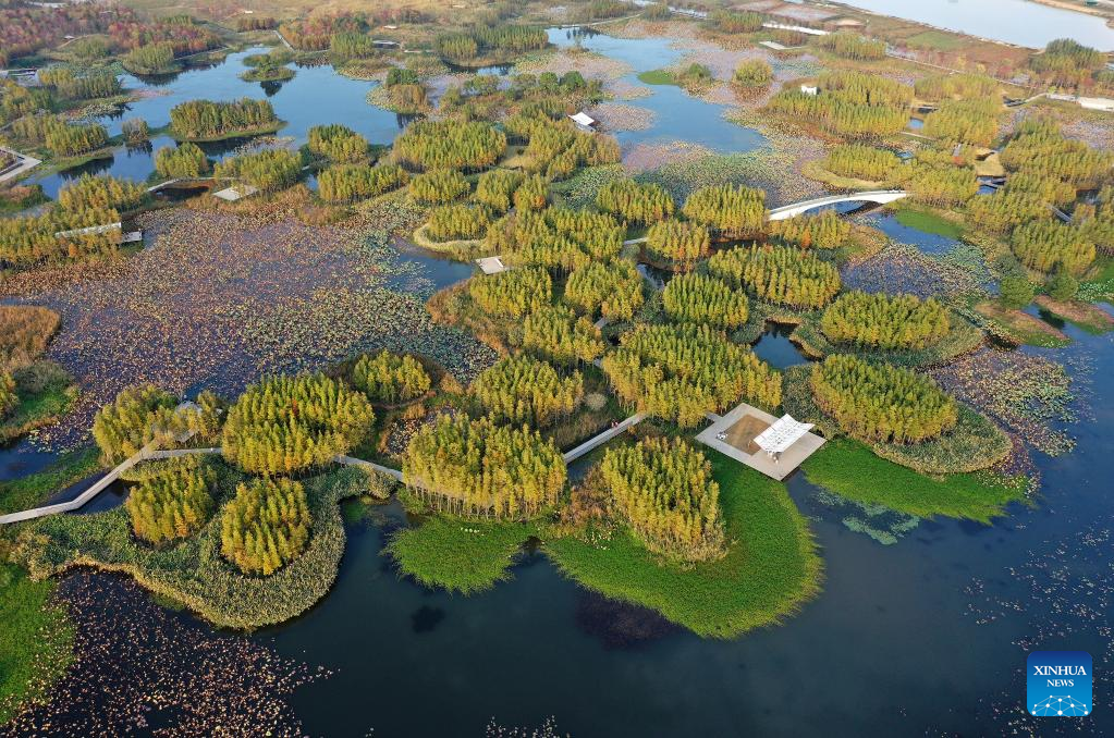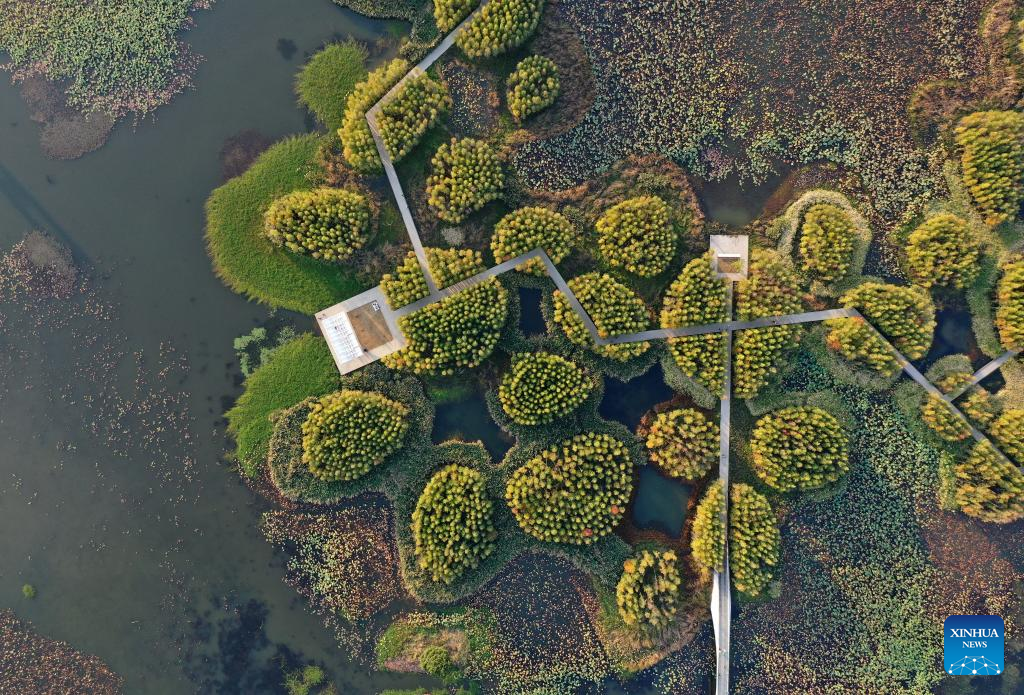 This aerial photo taken on Nov. 8, 2022 shows scenery of Yuweizhou wetland park in Nanchang, capital of east China's Jiangxi Province. Nanchang has two wetlands of international importance, eight national wetland parks, four wetlands of provincial importance and five provincial wetland parks. It was accredited on Nov. 10, 2022 by the Ramsar Convention as an international wetland city. (Xinhua/Wan Xiang)
