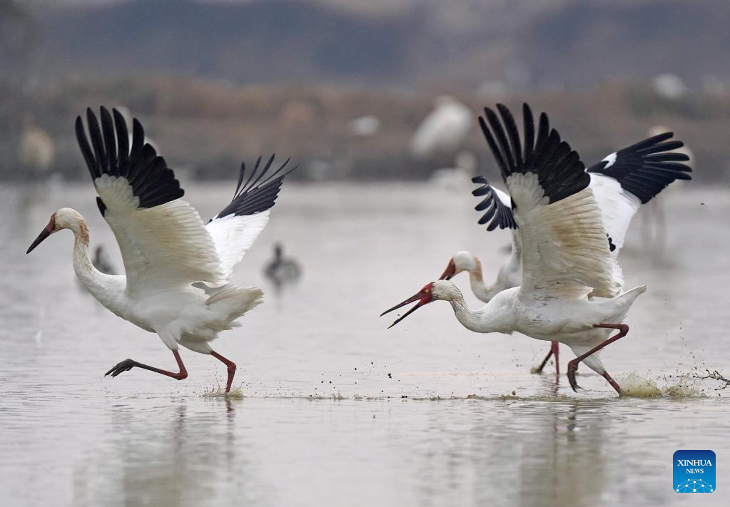 This photo taken on Dec. 3, 2019 shows white cranes at a crane sanctuary in Nanchang, capital of east China's Jiangxi Province. Nanchang has two wetlands of international importance, eight national wetland parks, four wetlands of provincial importance and five provincial wetland parks. It was accredited on Nov. 10, 2022 by the Ramsar Convention as an international wetland city. (Xinhua/Zhou Mi)