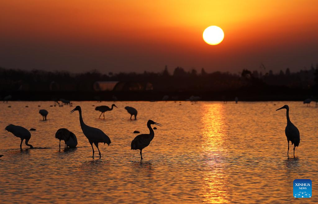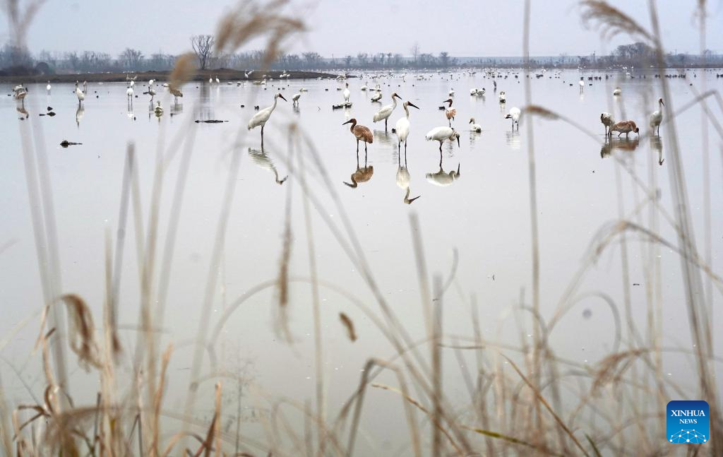 This photo taken on Dec. 21, 2021 shows migrant birds at a crane sanctuary in Nanchang, capital of east China's Jiangxi Province. Nanchang has two wetlands of international importance, eight national wetland parks, four wetlands of provincial importance and five provincial wetland parks. It was accredited on Nov. 10, 2022 by the Ramsar Convention as an international wetland city. (Xinhua/Wan Xiang)