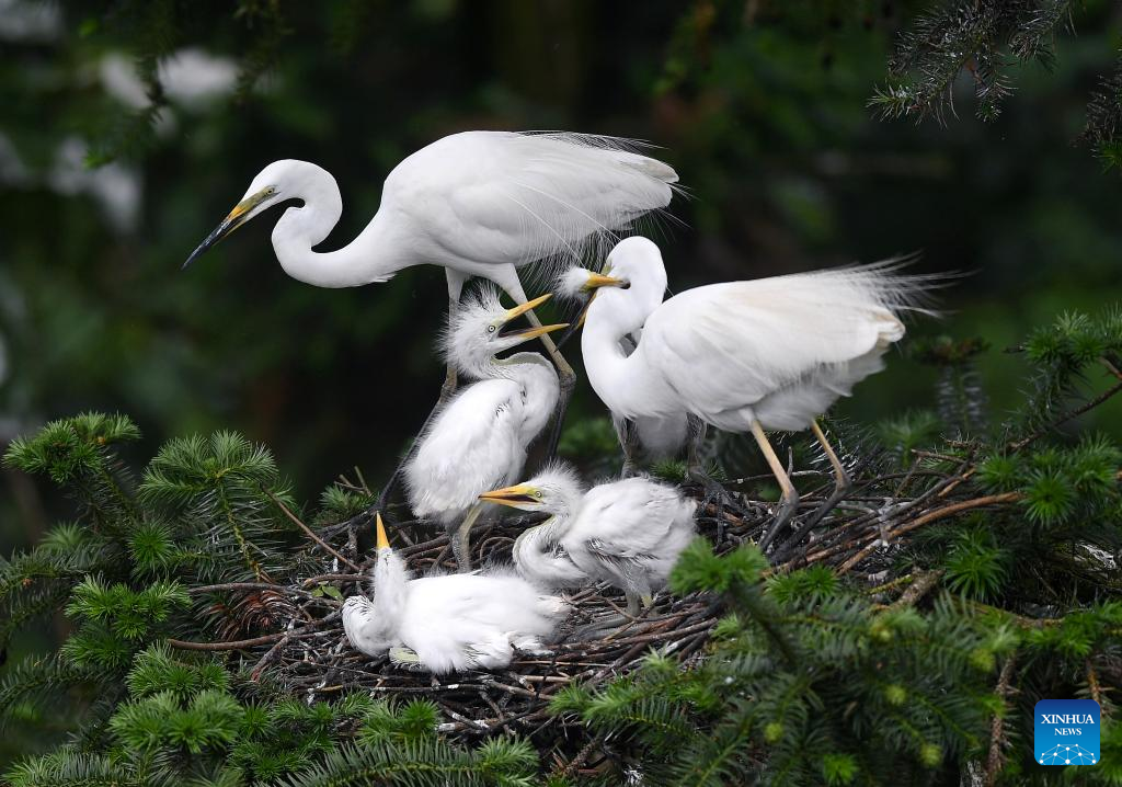 This photo taken on May 18, 2021 shows an egret feeding its babies at Xiangshan forest park in Xinjian District of Nanchang, capital of east China's Jiangxi Province. Nanchang has two wetlands of international importance, eight national wetland parks, four wetlands of provincial importance and five provincial wetland parks. It was accredited on Nov. 10, 2022 by the Ramsar Convention as an international wetland city. (Xinhua/Wan Xiang)