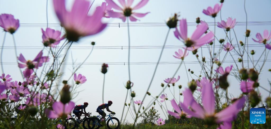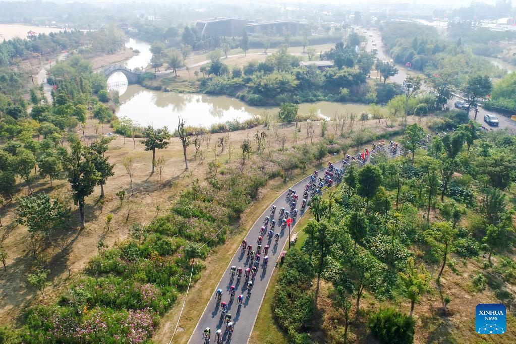 This photo taken on Sept. 28, 2019 shows cyclists competing during the Tour of Poyang Lake in Nanchang, capital of east China's Jiangxi Province. Nanchang has two wetlands of international importance, eight national wetland parks, four wetlands of provincial importance and five provincial wetland parks. It was accredited on Nov. 10, 2022 by the Ramsar Convention as an international wetland city. (Xinhua/Zhou Mi)