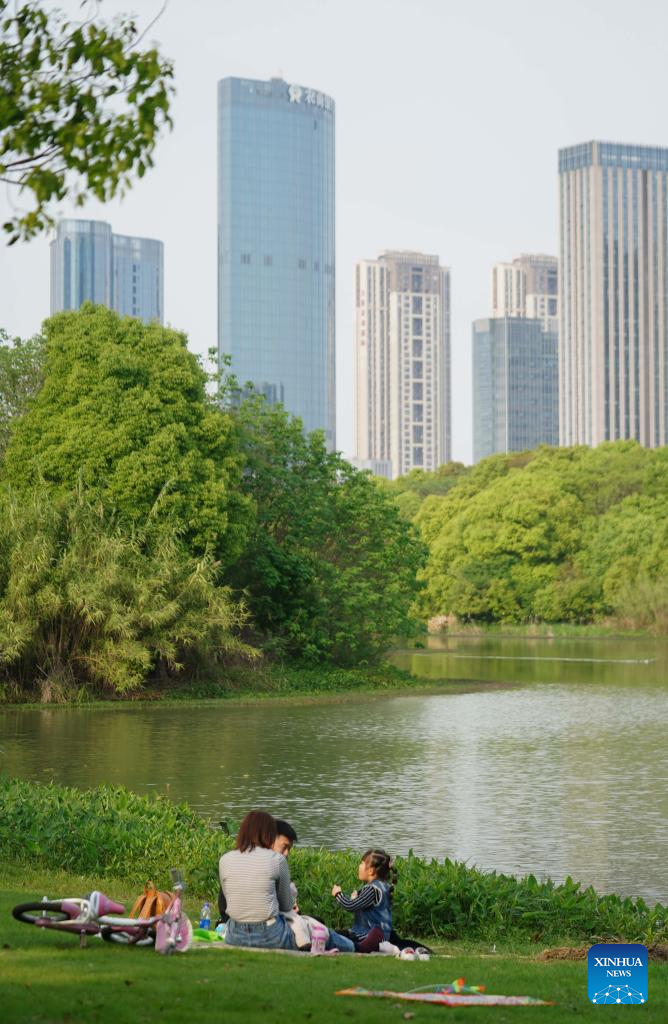 This photo taken on April 6, 2020 shows local residents resting on lawn at Aixi Lake wetland park in Nanchang, capital of east China's Jiangxi Province. Nanchang has two wetlands of international importance, eight national wetland parks, four wetlands of provincial importance and five provincial wetland parks. It was accredited on Nov. 10, 2022 by the Ramsar Convention as an international wetland city. (Xinhua/Zhou Mi)