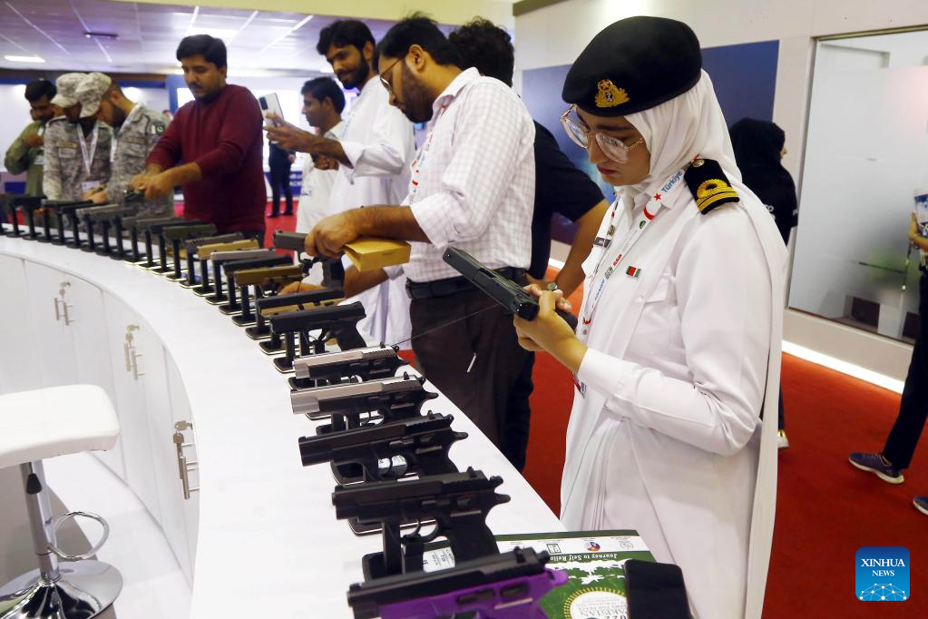 A man checks a gun at the International Defense Exhibition and Seminar (IDEAS) in Karachi, Pakistan on Nov. 16, 2022. The 11th edition of IDEAS is held at the Karachi Expo Center in Pakistan's southern port city of Karachi. (Str/Xinhua)