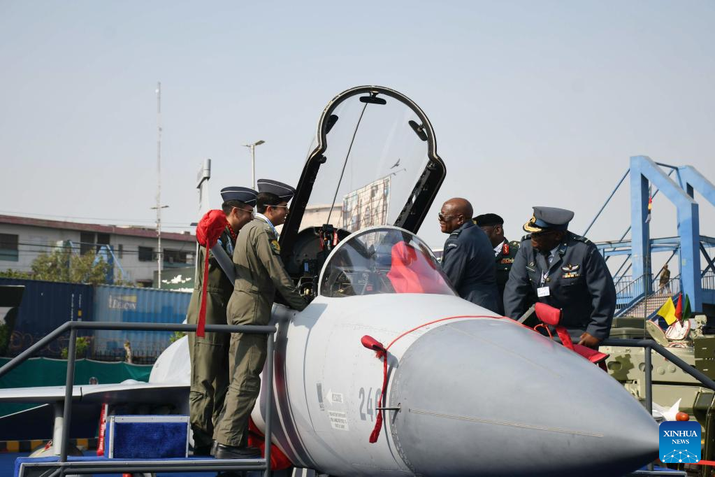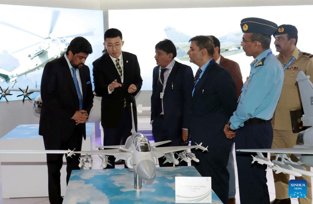 People visit the China Pavilion at the International Defense Exhibition and Seminar (IDEAS) in Karachi, Pakistan on Nov. 16, 2022. The 11th edition of IDEAS is held at the Karachi Expo Center in Pakistan's southern port city of Karachi. (Str/Xinhua)