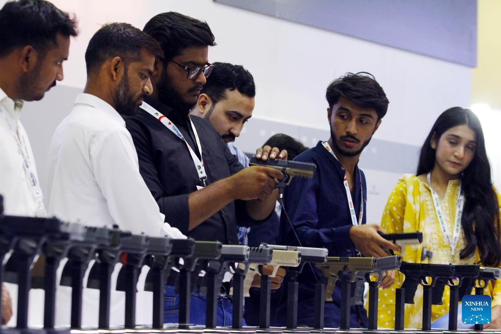 People visit the International Defense Exhibition and Seminar (IDEAS) in Karachi, Pakistan on Nov. 16, 2022. The 11th edition of IDEAS is held at the Karachi Expo Center in Pakistan's southern port city of Karachi. (Str/Xinhua)