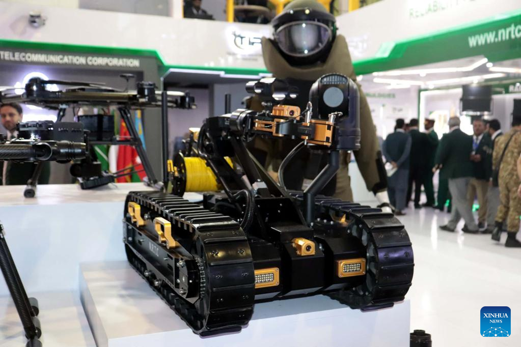 A bomb disposal robot is displayed at the International Defense Exhibition and Seminar (IDEAS) in Karachi, Pakistan on Nov. 16, 2022. The 11th edition of IDEAS is held at the Karachi Expo Center in Pakistan's southern port city of Karachi. (Str/Xinhua)
