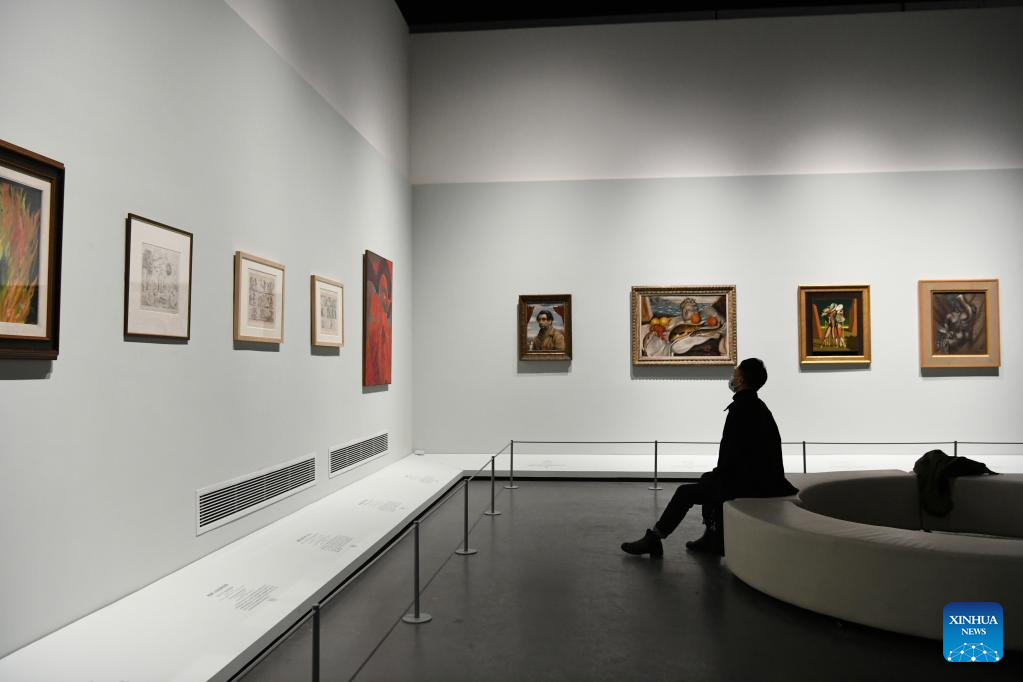 A visitor views exhibits at an exhibition of modern and contemporary European artworks in Chengdu Museum in Chengdu, southwest China's Sichuan Province, Nov. 25, 2022. An exhibition of modern and contemporary European artworks kicked off Friday in the southwestern Chinese city of Chengdu. (Xinhua/Tang Wenhao)