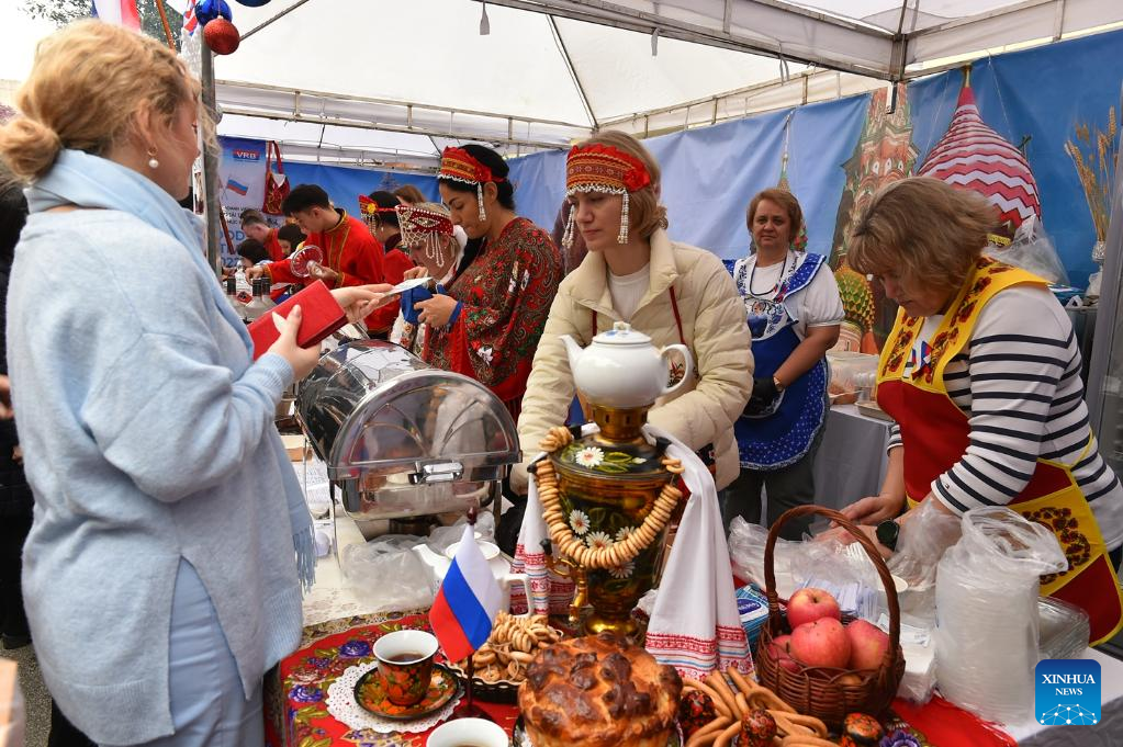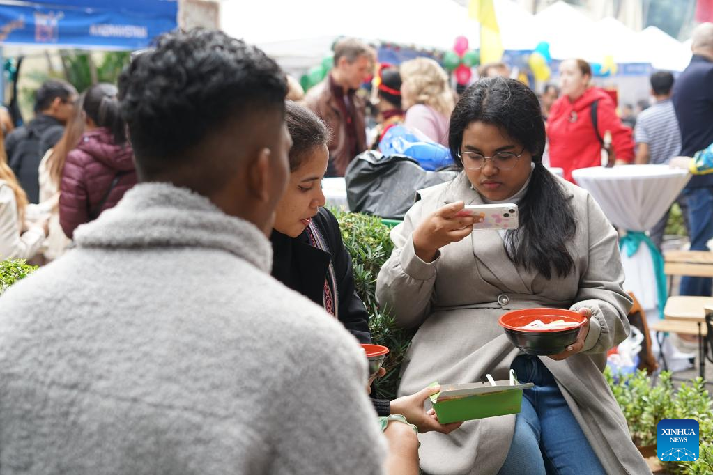 People enjoy food at the 2022 International Food Festival in Hanoi, Vietnam, on Dec. 11, 2022. The 2022 International Food Festival took place here on Sunday, featuring more than 100 booths with unique culinary experiences from different cultures. (Xinhua/Hu Jiali)