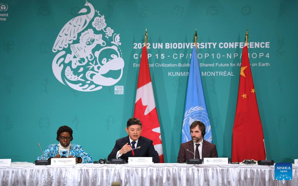 Huang Runqiu (C), China's minister of ecology and environment and also president of the 15th meeting of the Conference of the Parties (COP15) to the UN Convention on Biological Diversity, speaks during a press conference in Montreal, Canada, on Dec. 13, 2022. All parties need to show greater courage, wisdom and determination to close gaps and divides to promote reaching a final outcome at a key UN biodiversity conference, Huang Runqiu said Tuesday. (Xinhua/Ren Pengfei)