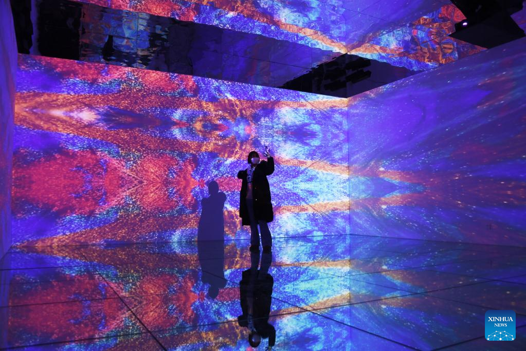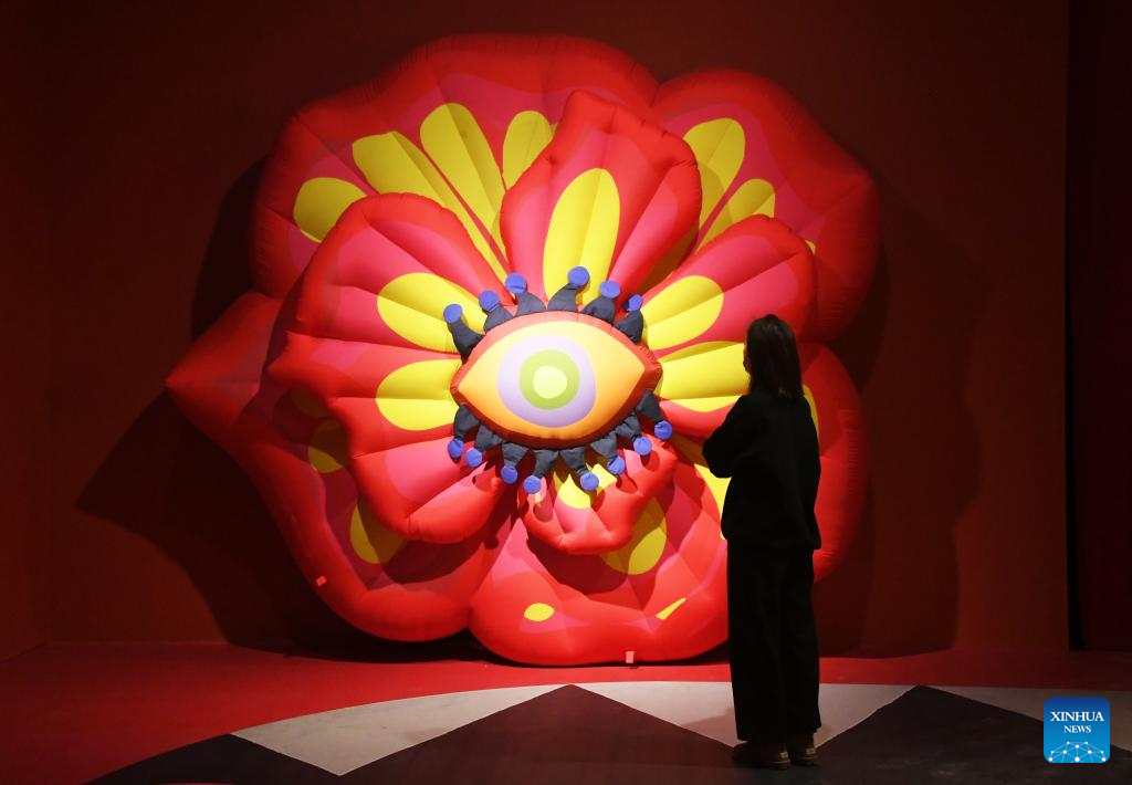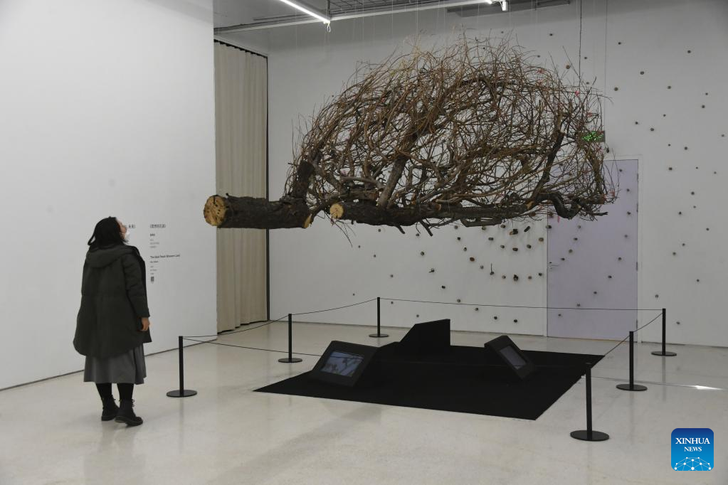 A visitor views art installations at Blooming Echoes, an exhibition featuring the combination of sound and modern art, at the Times Art Museum in Beijing, capital of China, Dec. 21, 2022. (Xinhua/Ren Chao)