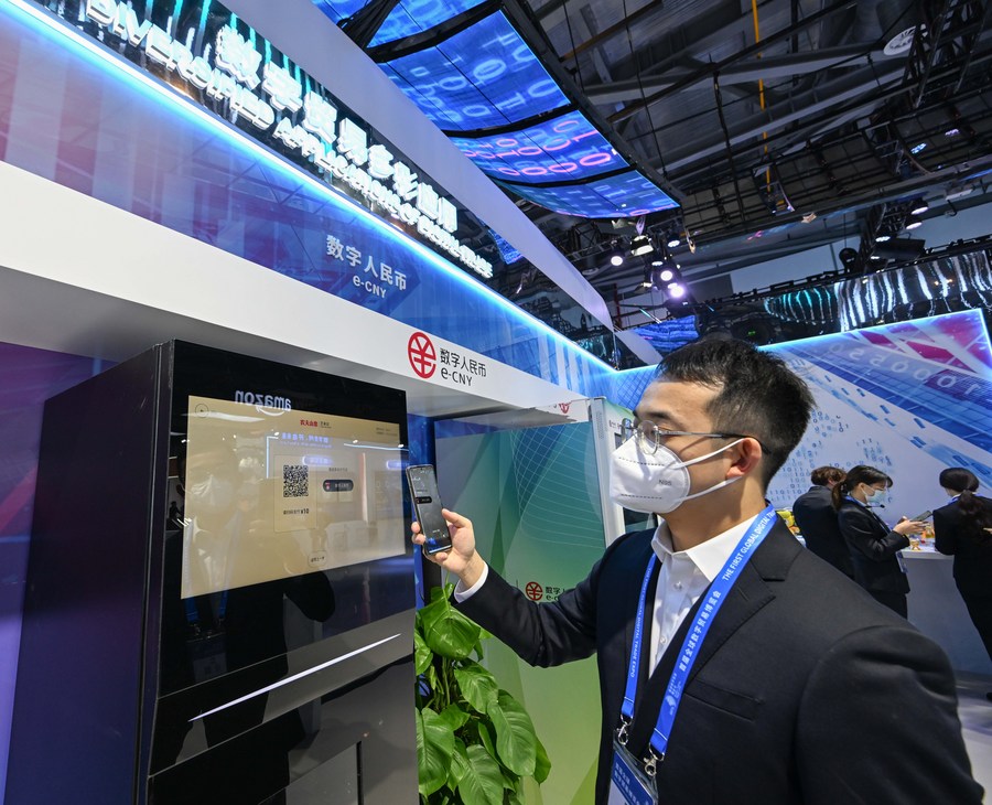 A staff member demonstrates the payment with China's digital yuan, or the e-CNY, during the first Global Digital Trade Expo in Hangzhou, east China's Zhejiang Province, Dec. 12, 2022.(Xinhua/Xu Yu)