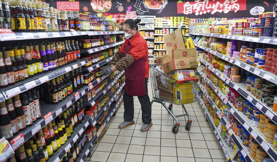 A staff member puts goods onto shelves at a supermarket in Tianshan District of Urumqi, northwest China's Xinjiang Uygur Autonomous Region, Nov. 28, 2022. (Photo by Zhou Peng/Xinhua)