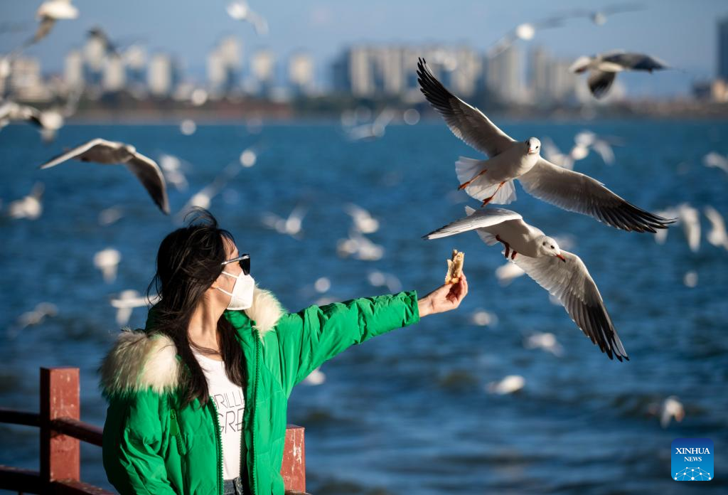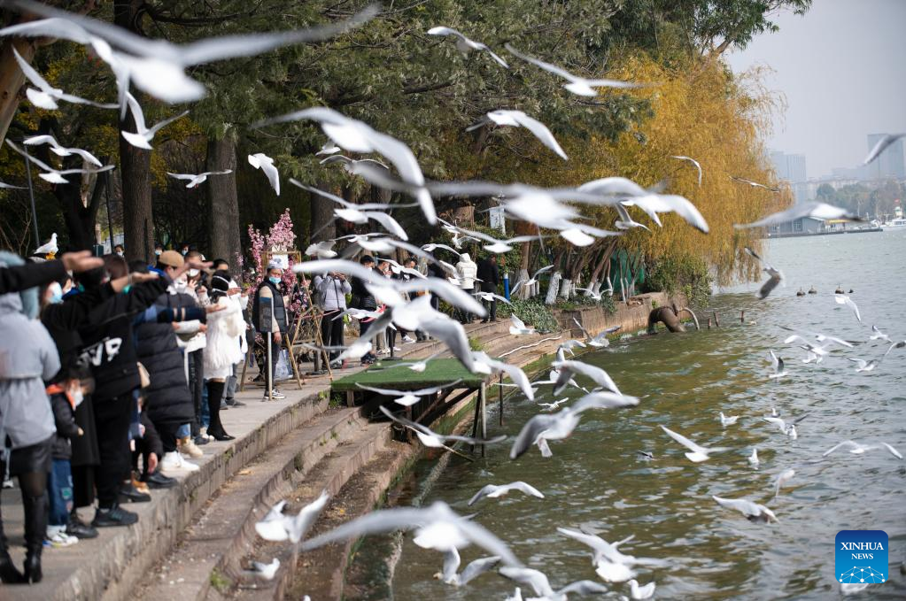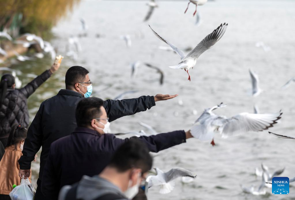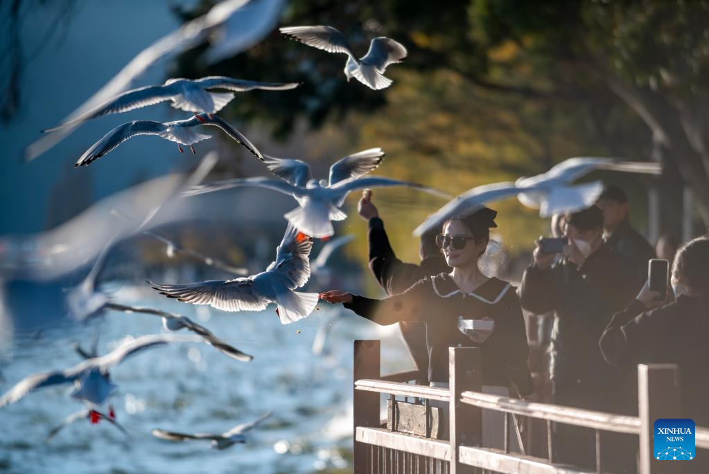 Visitors feed black-headed gulls at the Haigeng Park in Kunming, southwest China's Yunnan Province, Dec. 24, 2022. (Xinhua/Chen Xinbo)