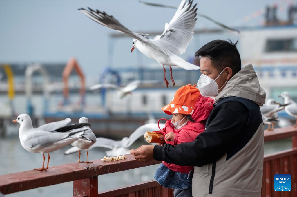 Visitors feed black-headed gulls at Haigeng east pier in Kunming, southwest China's Yunnan Province, Dec. 24, 2022. (Xinhua/Chen Xinbo)