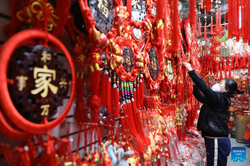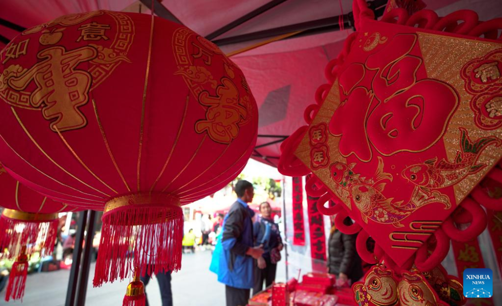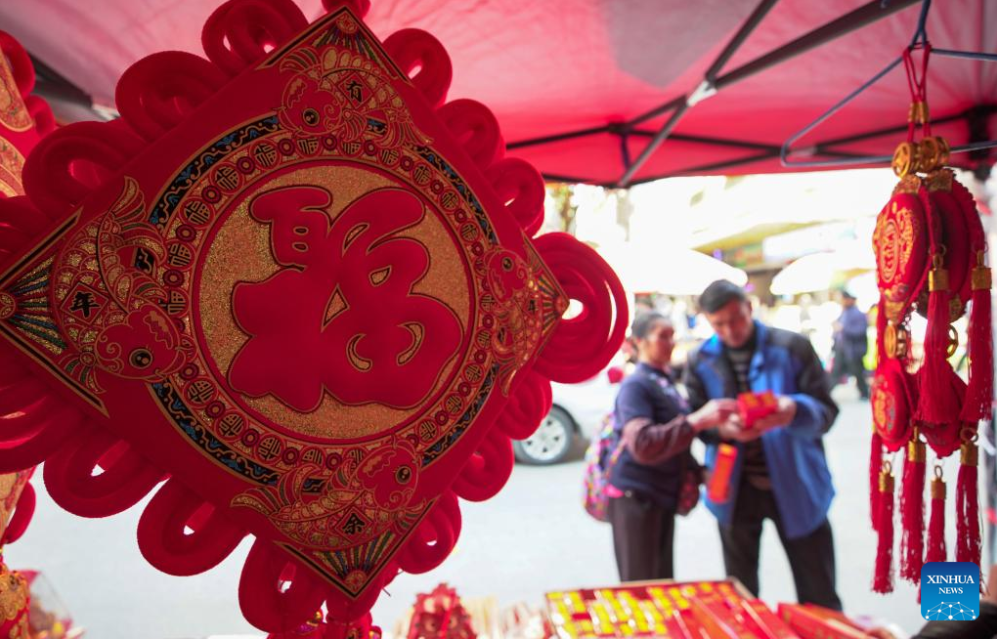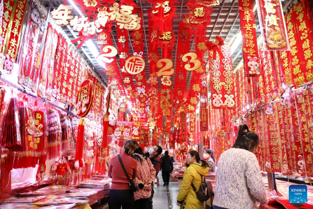Residents shop the Spring Festival decorations at a market in Kunming, southwest China's Yunnan Province, Jan. 10, 2023. Markets across the country are full of vitality as the Spring Festival draws near. (Photo by Hao Yaxin/Xinhua)