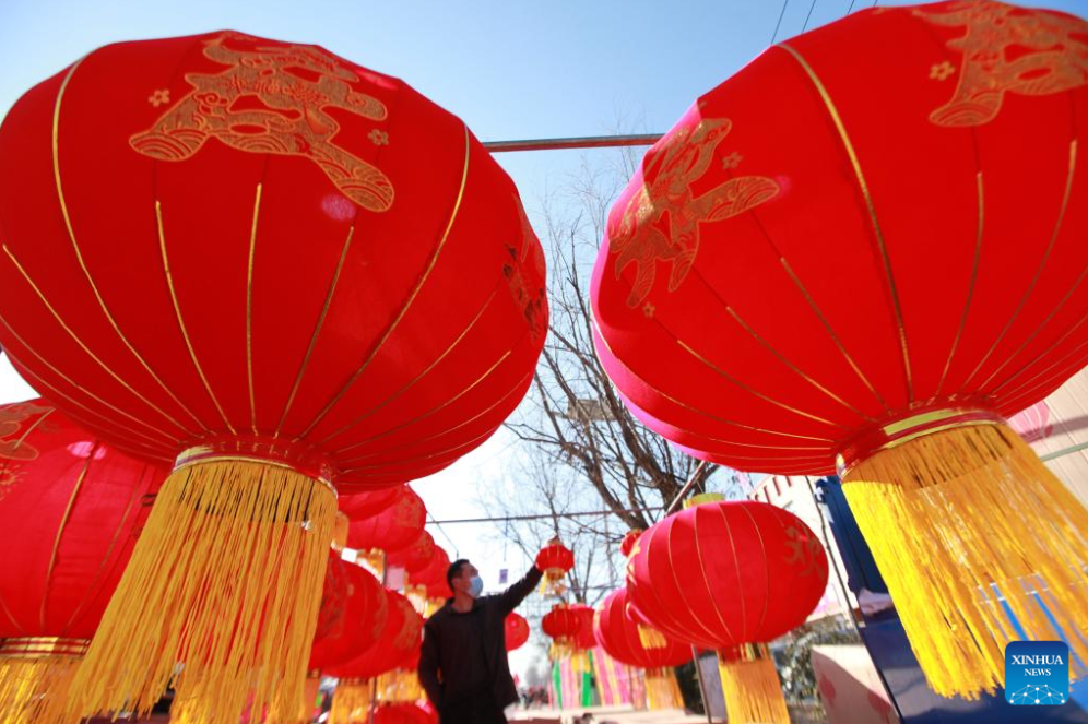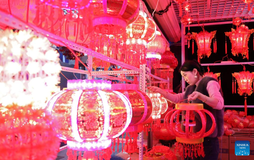 A vendor arranges lanterns at a market in Shenyang, northeast China's Liaoning Province, Jan. 11, 2023. Markets across the country are full of vitality as the Spring Festival draws near. (Xinhua/Yao Jianfeng)