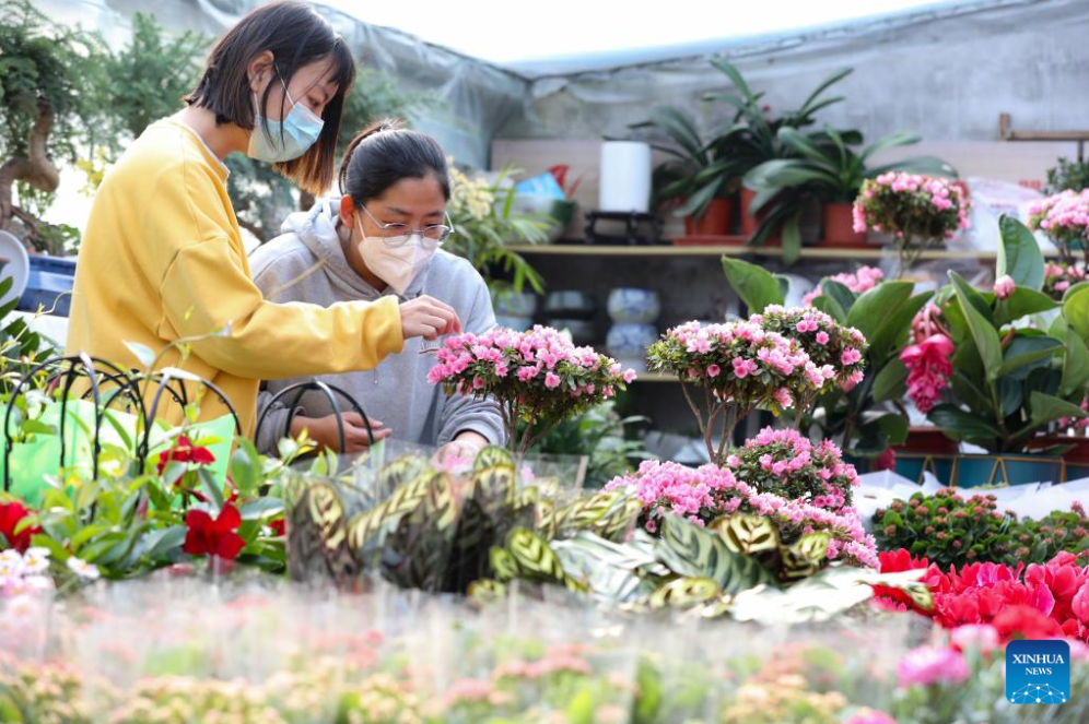 People buy flowers at a flower planting base in Hancun Town of Zhaoxian County, Shijiazhuang, north China's Hebei Province, Jan. 10, 2023. Markets across the country are full of vitality as the Spring Festival draws near. (Photo by Zhu Tao/Xinhua)