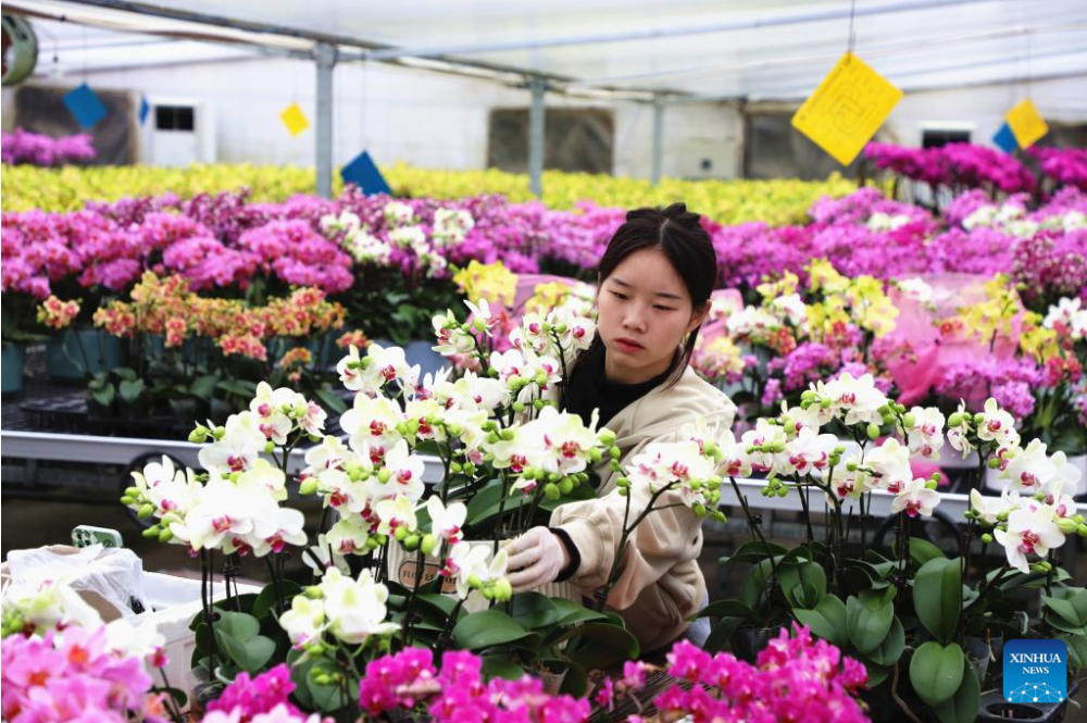 A staff member arranges flowers for sale at a flower planting base in Feixi County, Hefei City, east China's Anhui Province, Jan. 10, 2023. Markets across the country are full of vitality as the Spring Festival draws near. (Photo by Chen Jiale/Xinhua)