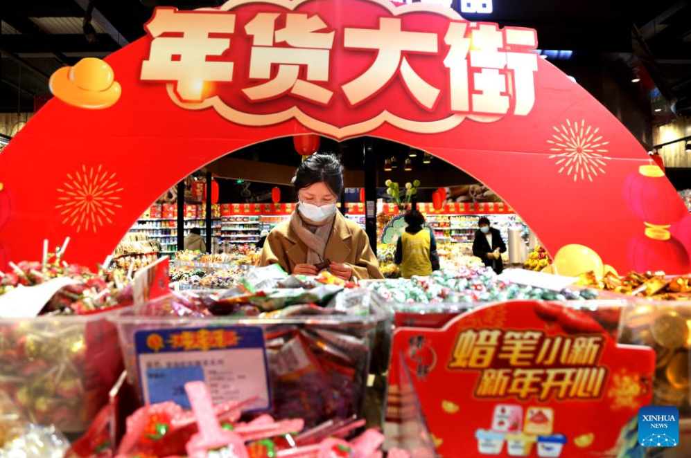 People shop for the Spring Festival at a supermarket in Lianyun District of Lianyungang, east China's Jiangsu Province, Jan. 10, 2023. Markets across the country are full of vitality as the Spring Festival draws near. (Photo by Wang Chun/Xinhua)