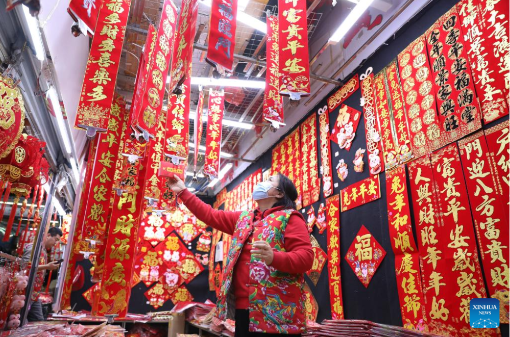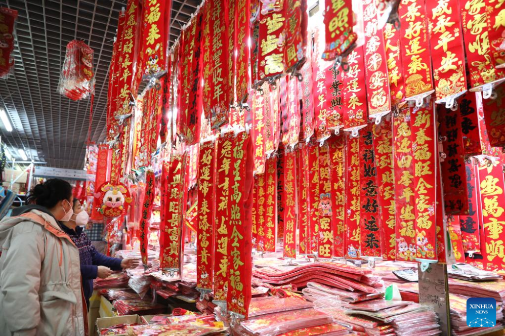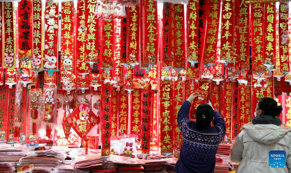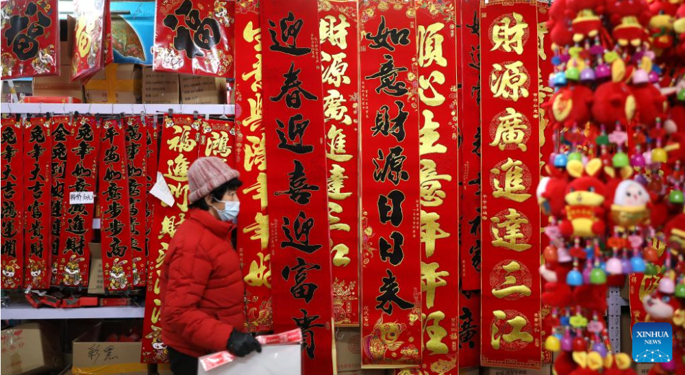 A vendor arranges couplets at a market in Shenyang, northeast China's Liaoning Province, Jan. 11, 2023. Markets across the country are full of vitality as the Spring Festival draws near. (Xinhua/Yao Jianfeng)