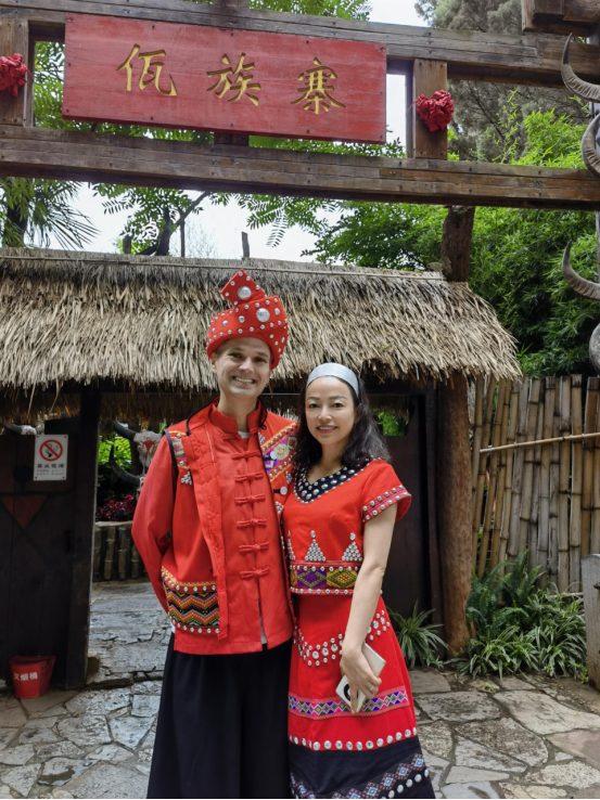 "We met at work. It could be said that we fell in love at second sight." Andre said with a smile. He and his wife would travel together. When they went to the "Fanrenguzhai" in Ninglang County, they wore Pumi costumes.