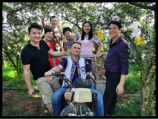 In Mengzi, Andre and his friends took a group photo under the century-old pomegranate tree. Photo provided