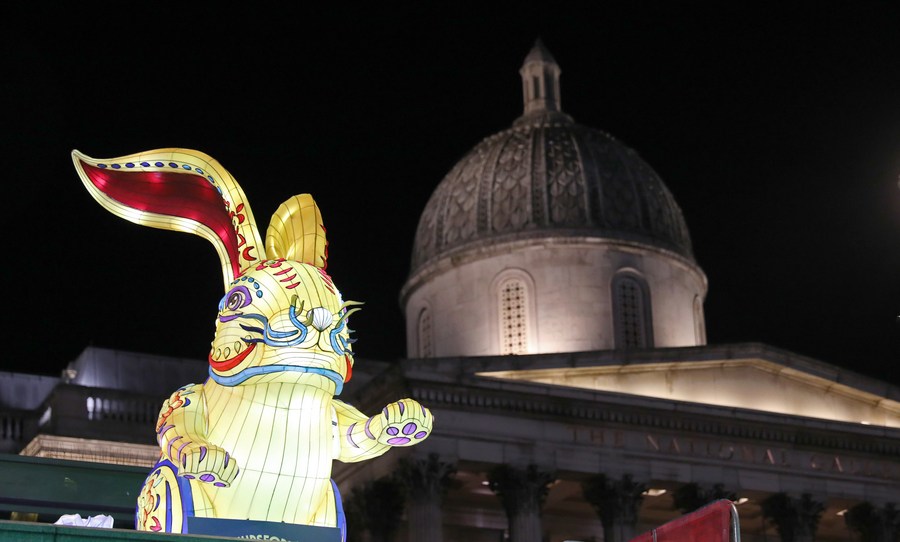 This photo taken on Jan. 21, 2023 shows a large lantern celebrating the Year of the Rabbit on the eve of the Chinese New Year at Trafalgar Square in London, Britain. (Xinhua/Li Ying)