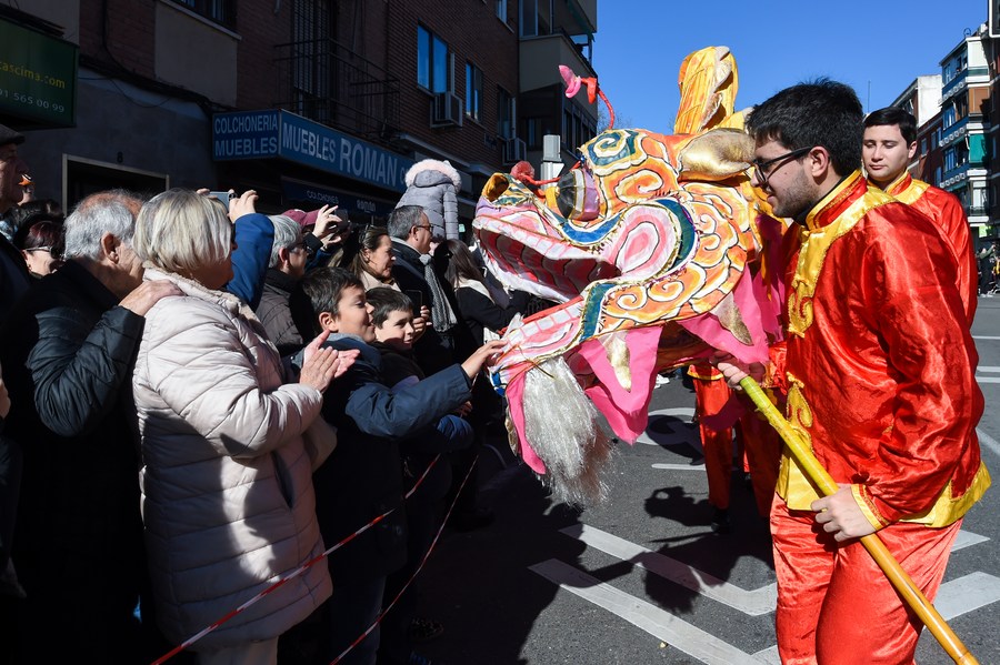 People watch a dragon dance performance during a parade celebrating the Chinese New Year in Madrid, Spain, Jan. 22, 2023. (Photo by Gustavo Valiente/Xinhua)