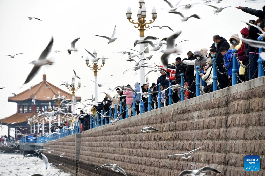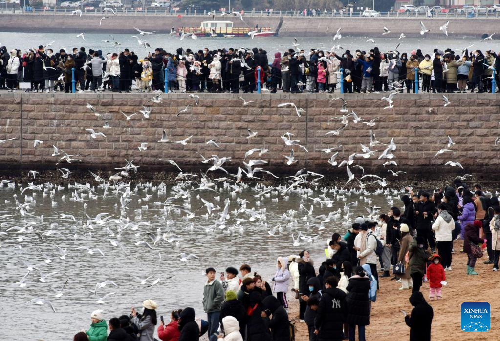 Visitors watch seagulls in Qingdao, east China's Shandong Province, Jan. 26, 2023. Watching seagulls during Spring Festival is a tradition in Qingdao. Nowadays, with the improvement of ecological environment, the species of seagulls in Qingdao has increased to over 20 and the amount has surpassed 100, 000. (Xinhua/Li Ziheng)