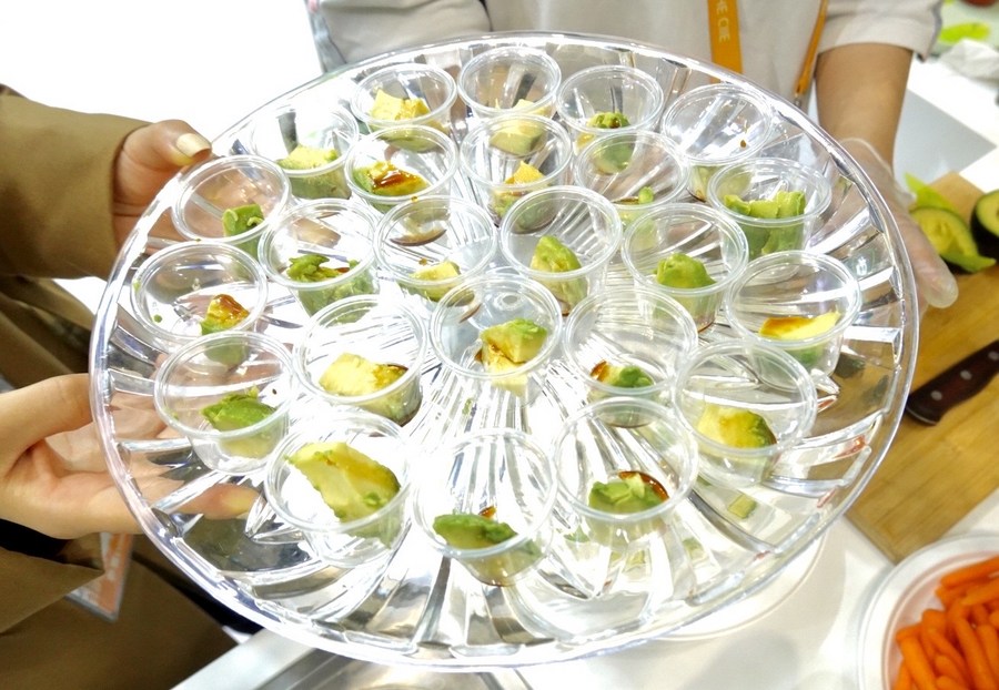 Staff members present pieces of avocado at Food and Agricultural Products exhibition area during the second China International Import Expo (CIIE) in Shanghai, east China, Nov. 9, 2019. (Xinhua/Cai Yang)