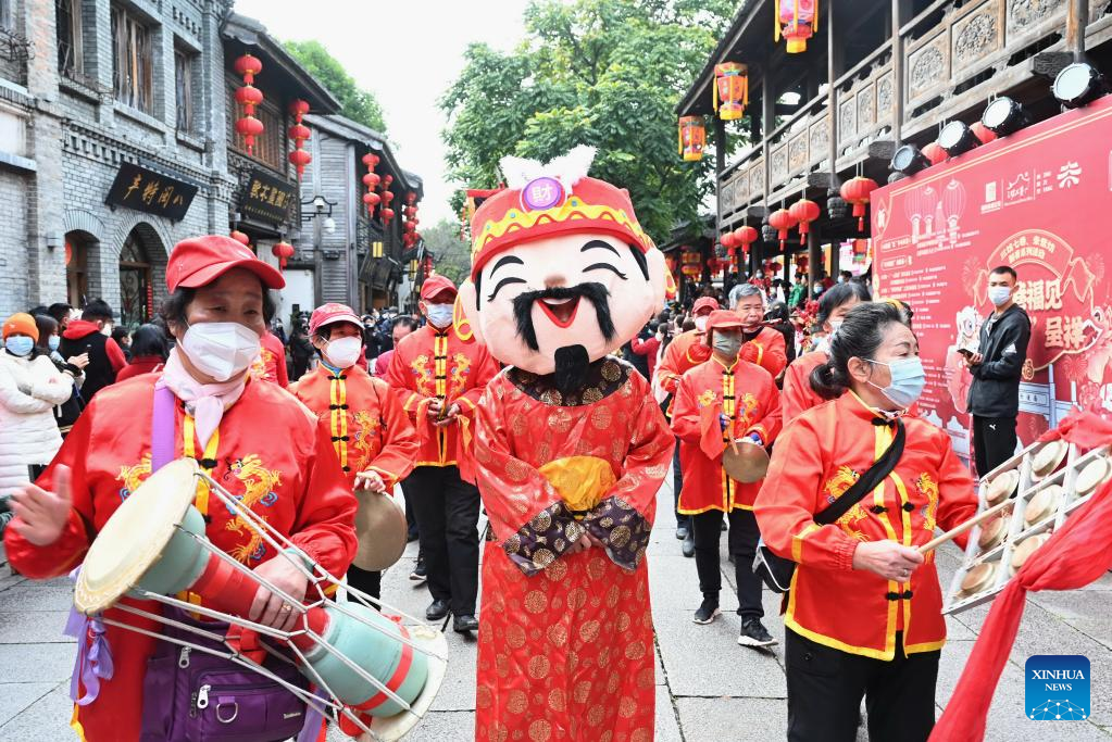 People take part in a parade welcoming the God of Wealth at Sanfangqixiang (Three Lanes and Seven Alleys), an ancient block in downtown Fuzhou, southeast China's Fujian Province, Jan. 26, 2023. Ceremonies were held to welcome the God of Wealth as a tradition on the fifth day of the Chinese Lunar New Year, which falls on Thursday this year. (Xinhua/Lin Shanchuan)