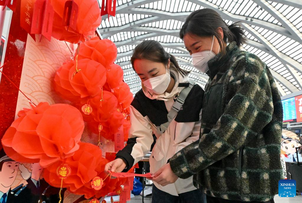 People guess lantern riddles at the waiting hall of the Tianjin West Railway Station in north China's Tianjin, Feb. 5, 2023. People celebrate the Lantern Festival, the 15th day of the first month of the Chinese lunar calendar, with various traditional customs across the country. (Xinhua/Sun Fanyue)
