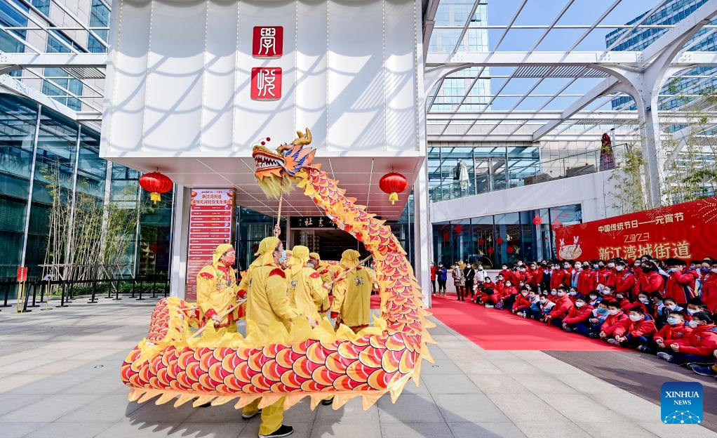 People perform dragon dance in Yangpu District, east China's Shanghai, Feb. 5, 2023. People celebrate the Lantern Festival, the 15th day of the first month of the Chinese lunar calendar, with various traditional customs across the country. (Xinhua)