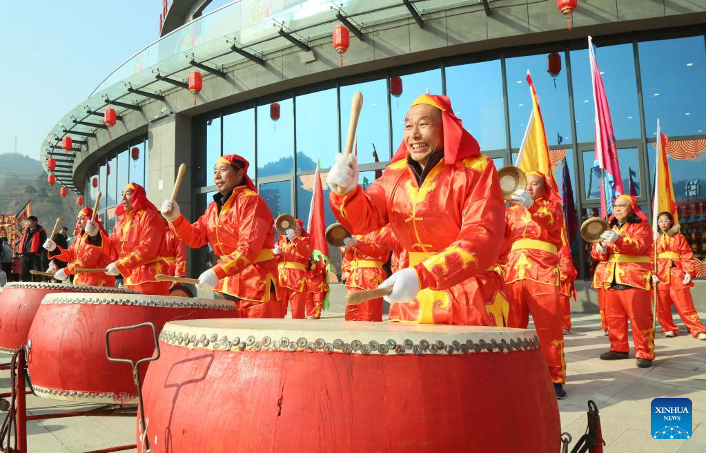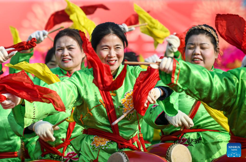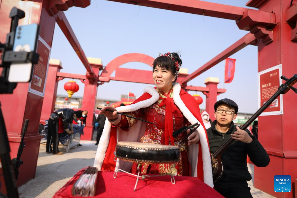 Folk artists perform "Dongbei Dagu", a folk art of drum music and recitative, at a country fair in Yingkou, northeast China's Liaoning Province, Feb. 5, 2023. People celebrate the Lantern Festival, the 15th day of the first month of the Chinese lunar calendar, with various traditional customs across the country. (Xinhua/Yao Jianfeng)