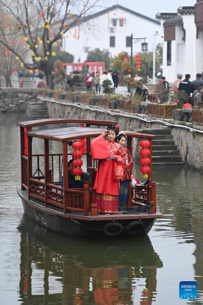 Tourists in traditional costume enjoy boat ride in Lucun Village of Balidian Town, Huzhou City, east China's Zhejiang Province, Feb. 5, 2023. People celebrate the Lantern Festival, the 15th day of the first month of the Chinese lunar calendar, with various traditional customs across the country. (Xinhua/Huang Zongzhi)