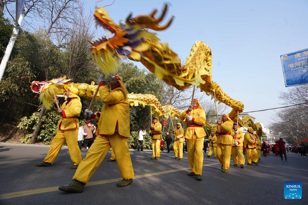 People perform dragon dance in Xuyi County in Huai'an, east China's Jiangsu Province, Feb. 5, 2023. People celebrate the Lantern Festival, the 15th day of the first month of the Chinese lunar calendar, with various traditional customs across the country. (Xinhua/Ji Chunpeng)