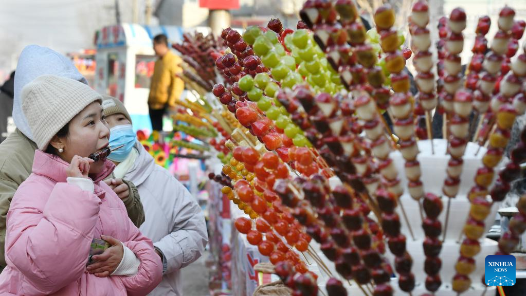 Tourists taste Tanghulu, a traditional Chinese snack of candied fruit, in Houlihua Village of Renqiu, north China's Hebei Province, Feb. 5, 2023. People celebrate the Lantern Festival, the 15th day of the first month of the Chinese lunar calendar, with various traditional customs across the country. (Xinhua/Mu Yu)