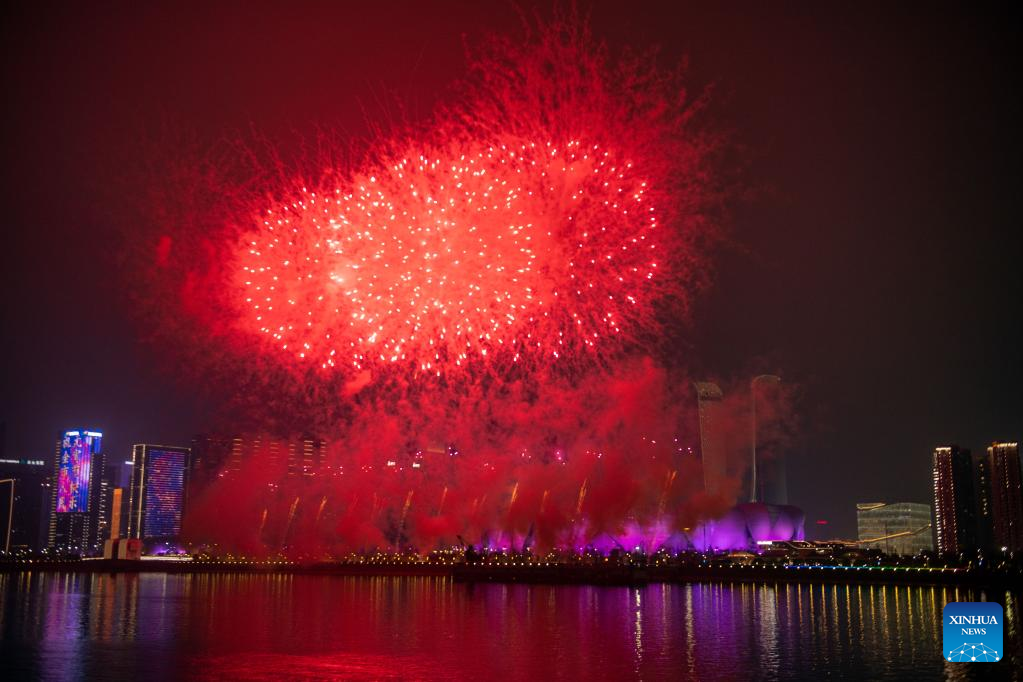 Fireworks explode in celebration of the Lantern Festival in Hangzhou, capital of east China's Zhejiang Province, Feb. 5, 2023. (Xinhua/Jiang Han)