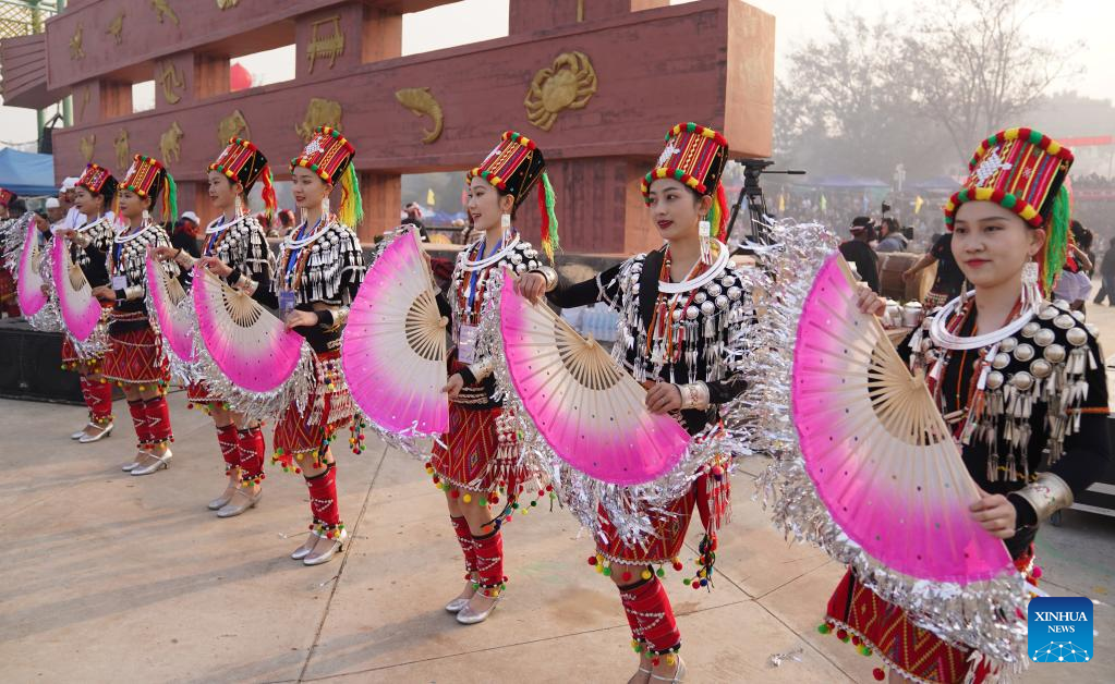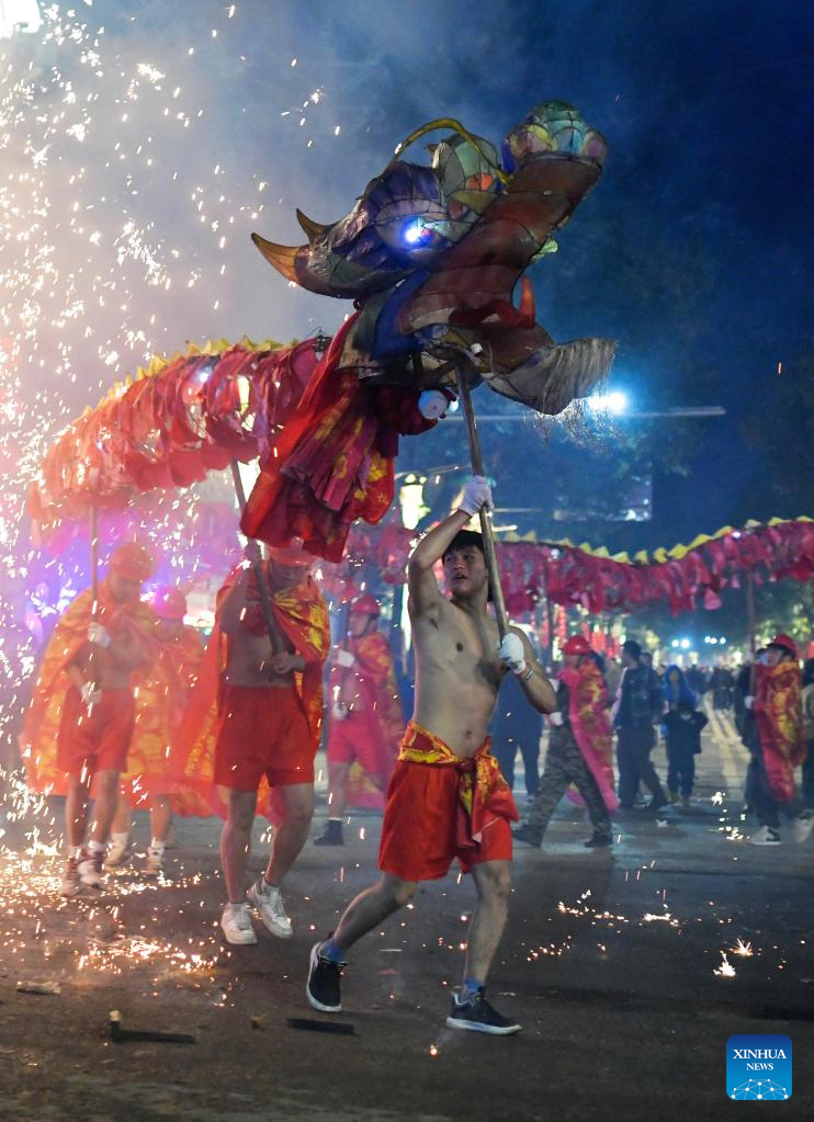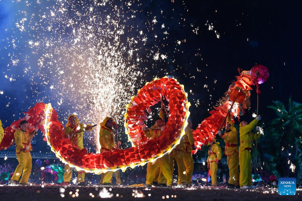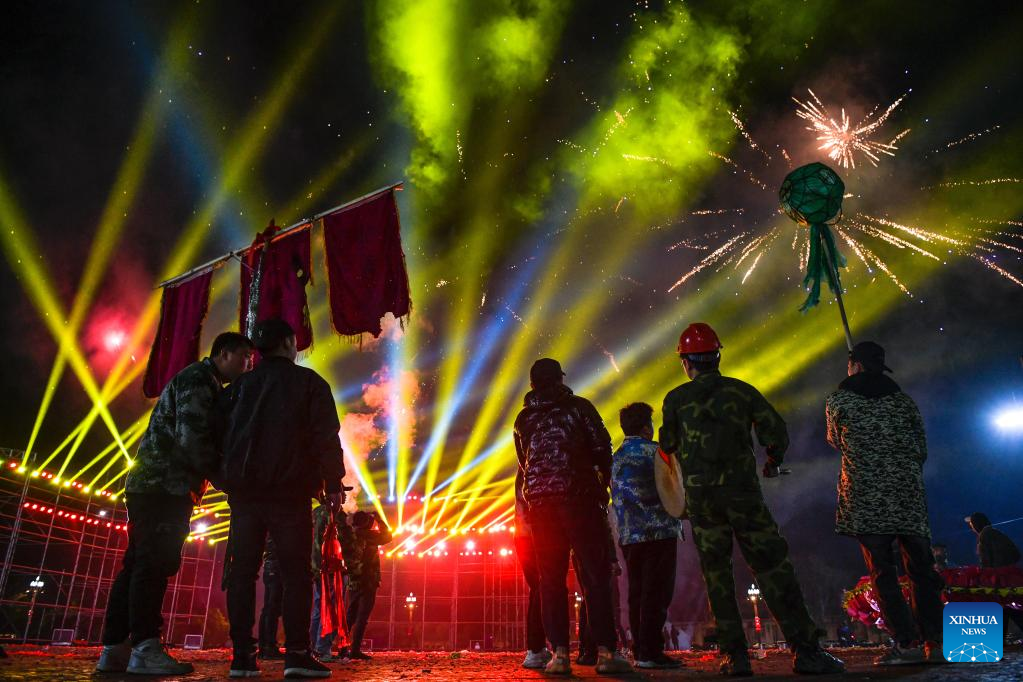 People perform in celebration of the Lantern Festival in Longchuan County of Dehong Dai and Jingpo Autonomous Prefecture, southwest China's Yunnan Province, Feb. 5, 2023. Various events are held across the country to celebrate the Lantern Festival, the 15th day of the first month of the Chinese lunar calendar, which falls on Feb. 5 this year. (Photo by Liang Zhiqiang/Xinhua)