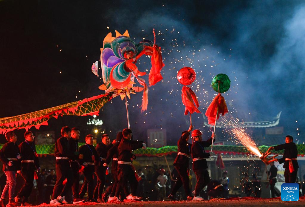 The traditional "Wulong Xuhua" show is a kind of dragon dance performed amid fireworks by the Miao ethnic group. Local people of Taijiang County attended a "Wulong Xuhua" competition on the eve of the Lantern Festival, the 15th day of the first month of the Chinese lunar calendar, which falls on Feb. 5 this year. (Xinhua/Yang Wenbin)