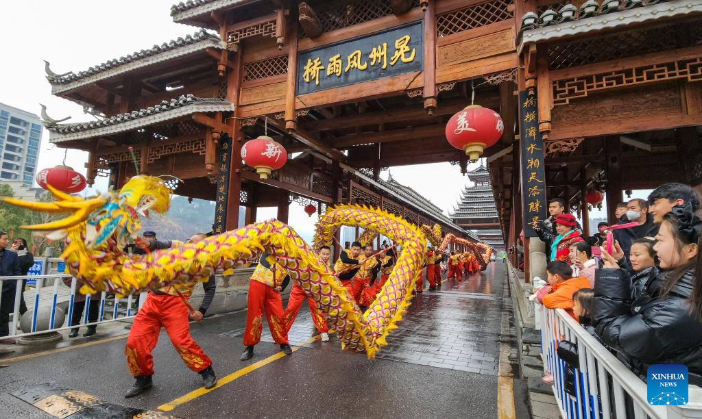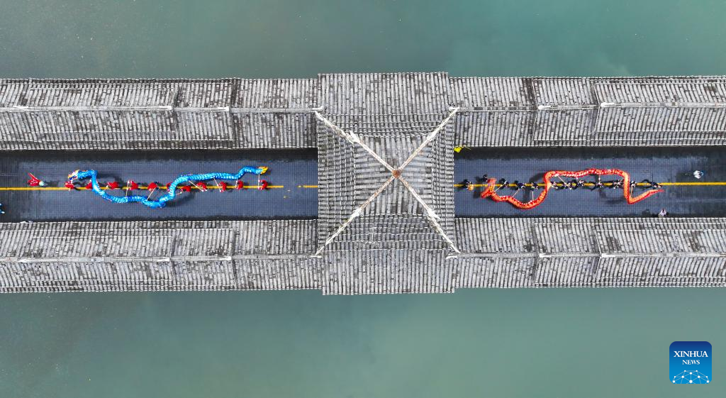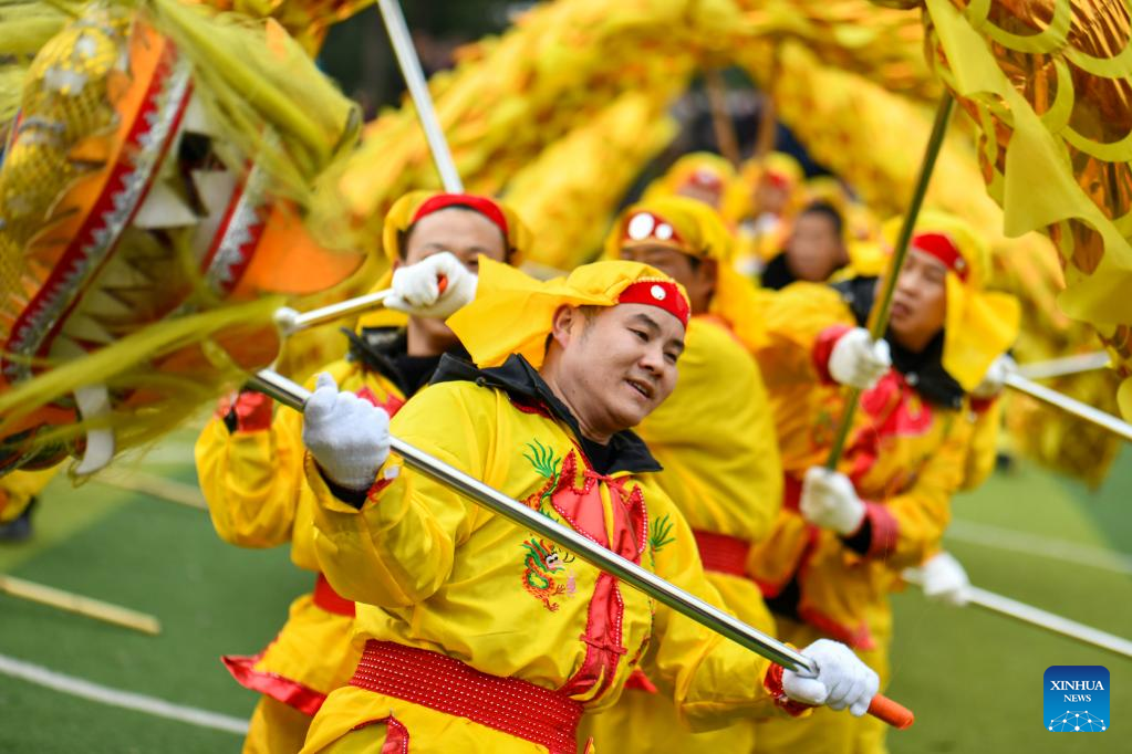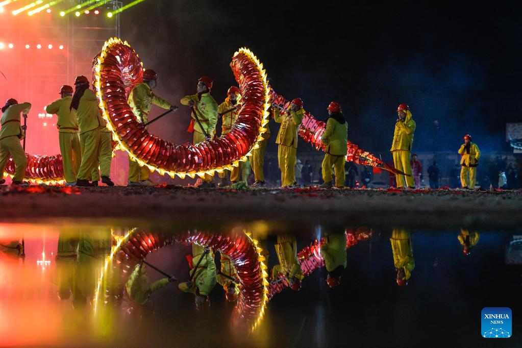 People perform "Wulong Xuhua" to celebrate the Lantern Festival in Taijiang County, southwest China's Guizhou Province, Feb. 4, 2023.