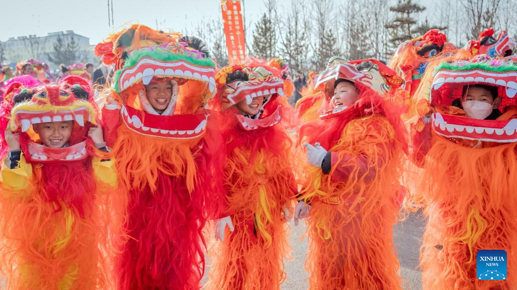 Children perform lion dance in Longde County in Guyuan, northwest China's Ningxia Hui Autonomous Region, Feb. 5, 2023. People celebrate the Lantern Festival, the 15th day of the first month of the Chinese lunar calendar, with various traditional customs across the country. (Photo by Tang Chengzhuo/Xinhua)