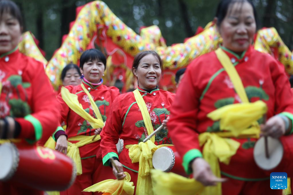 Members of a female waist drum team perform in Zixing City, central China's Hunan Province, Feb. 5, 2023. Various events are held across the country to celebrate the Lantern Festival, the 15th day of the first month of the Chinese lunar calendar, which falls on Feb. 5 this year. (Photo by Li Ke/Xinhua)