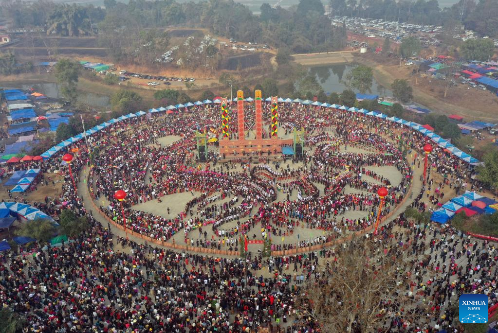 This aerial photo taken on Feb. 5, 2023 shows people celebrating the Lantern Festival in Longchuan County of Dehong Dai and Jingpo Autonomous Prefecture, southwest China's Yunnan Province. Various events are held across the country to celebrate the Lantern Festival, the 15th day of the first month of the Chinese lunar calendar, which falls on Feb. 5 this year. (Photo by Liang Zhiqiang/Xinhua)