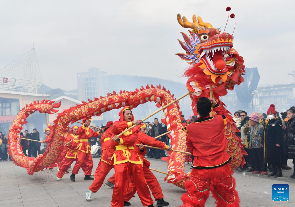 People perform dragon dance in Fudian Town, Ruyang County of Luoyang City, central China's Henan Province, Feb. 5, 2023. Various events are held across the country to celebrate the Lantern Festival, the 15th day of the first month of the Chinese lunar calendar, which falls on Feb. 5 this year. (Photo by Kang Hongjun/Xinhua)