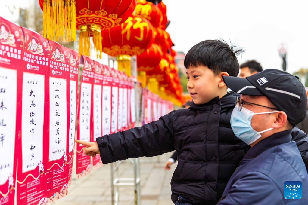 People guess lantern riddles in Xixiu District of Anshun City, southwest China's Guizhou Province, Feb. 5, 2023. Various events are held across the country to celebrate the Lantern Festival, the 15th day of the first month of the Chinese lunar calendar, which falls on Feb. 5 this year. (Photo by Chen Xi/Xinhua)