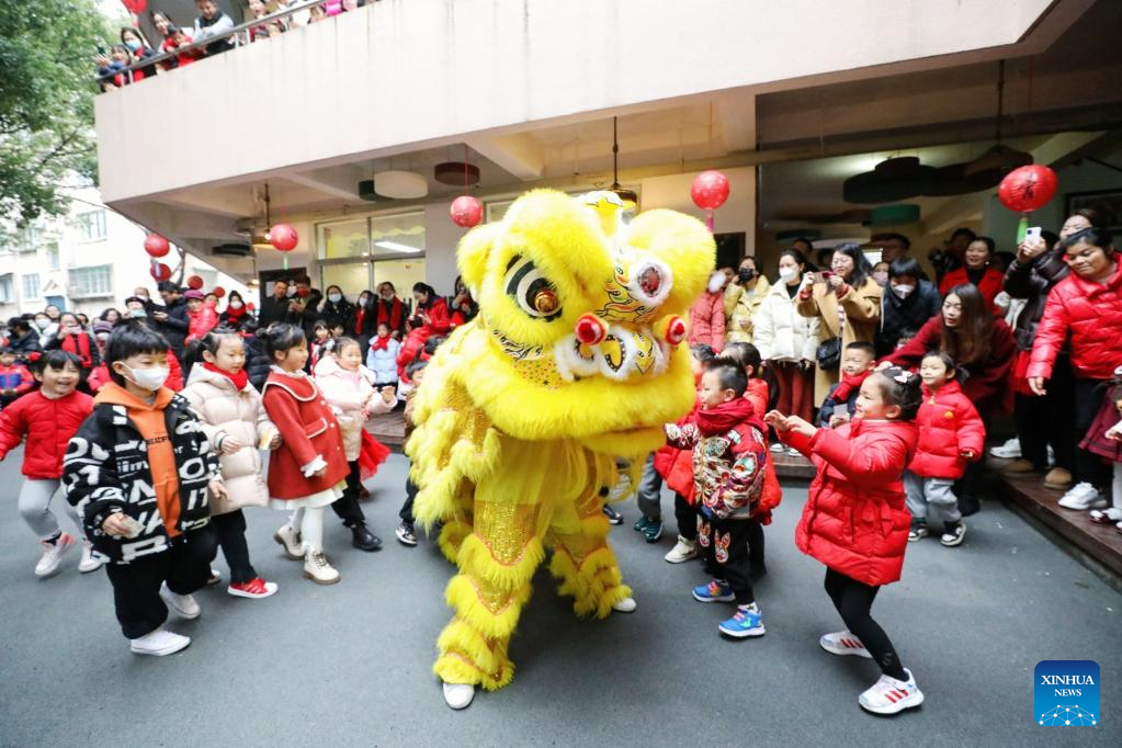 Children interact with lion dance performers at a kindergarten in Hangzhou City, east China's Zhejiang Province, Feb. 5, 2023. Various events are held across the country to celebrate the Lantern Festival, the 15th day of the first month of the Chinese lunar calendar, which falls on Feb. 5 this year. (Photo by Xu Junyong/Xinhua)
