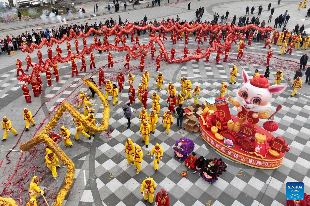 This aerial photo taken on Feb. 5, 2023 shows people performing dragon dance in Luxian County, southwest China's Sichuan Province. Various events are held across the country to celebrate the Lantern Festival, the 15th day of the first month of the Chinese lunar calendar, which falls on Feb. 5 this year. (Xinhua/Jiang Hongjing)