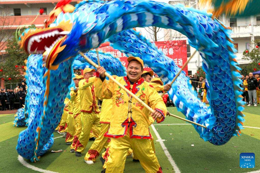 People perform dragon dance in Niuchang Village of Meitan County, Zunyi City, southwest China's Guizhou Province, Feb. 5, 2023. Various events are held across the country to celebrate the Lantern Festival, the 15th day of the first month of the Chinese lunar calendar, which falls on Feb. 5 this year. (Photo by Li Renjun/Xinhua)